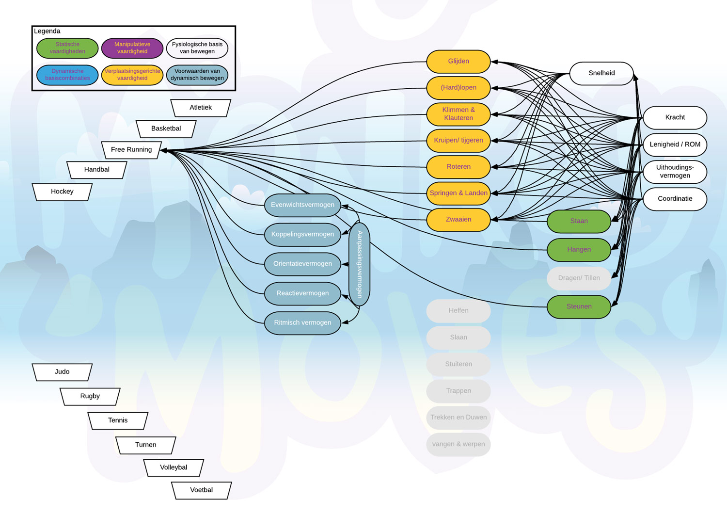 Als je goed naar Free running kijkt, dan kun je er een aantal basisvaardigheden uit halen. Bij Monkey Moves verdelen we deze vaardigheden in statische vaardigheden, verplaatsingsgerichte vaardigheden (waarbij je jezelf verplaatst) en manipulatieve vaardigheden (waarbij je iets of iemand verplaatst). Bij veel sporten ontwikkelen kinderen ook sociaal- emotionele vaardigheden.